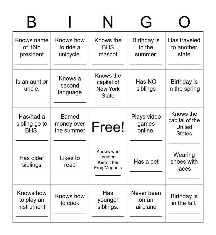 This bingo card has a free space and 33 words: Is taking an art class. __________, Plays sports __________, Earned money over the summer __________, Birthday is in the winter __________, Has older siblings __________, Knows a second language __________, Has traveled to another state __________, Knows how to play an instrument __________, Knows how to ride a unicycle. __________, Created a work of art (poem, song, drawing, etc.) __________, Knows the capital of New York State __________, Knows the BHS mascot __________, Has traveled outside the United States __________, Knows how to bake __________, Plays video games online. __________, Birthday is in the spring __________, Knows how to cook __________, Has/had a sibling go to BHS. __________, Likes to read __________, Has a pet __________, Knows who created Kermit the Frog/Muppets __________, Has a driver's license/permit __________, Knows name of 16th president __________, Knows the capital of the United States __________, Has younger siblings. __________, Birthday is in the fall. __________, Birthday is in the summer. __________, Has NO siblings __________, Is an aunt or uncle. __________, Wearing shoes with laces __________, Favorite Color is Purple __________, Never been on an airplane __________ and Was NOT born in Texas __________.