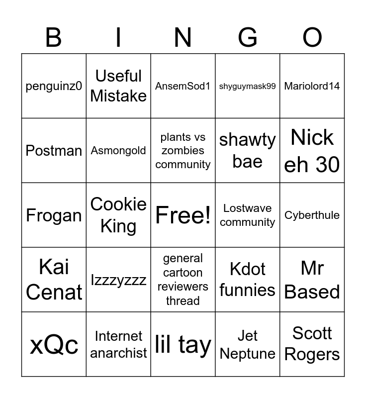 This bingo card has a free space and 24 words: Izzzyzzz, Internet anarchist, plants vs zombies community, xQc, Mariolord14, penguinz0, Postman, Useful Mistake, Lostwave community, general cartoon reviewers thread, shawty bae, Frogan, Kdot funnies, Mr Based, Asmongold, Jet Neptune, Cyberthule, AnsemSod1, Nick eh 30, Cookie King, Scott Rogers, Kai Cenat, shyguymask99 and lil tay.