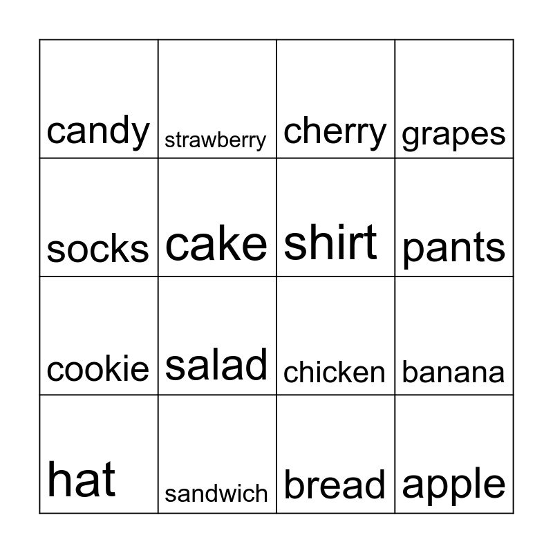 This bingo card has 18 words: salad, apple, cherry, candy, chicken, grapes, hat, strawberry, pants, cookie, bread, socks, banana, cake, shirt, hot dog, sandwich and skirt.