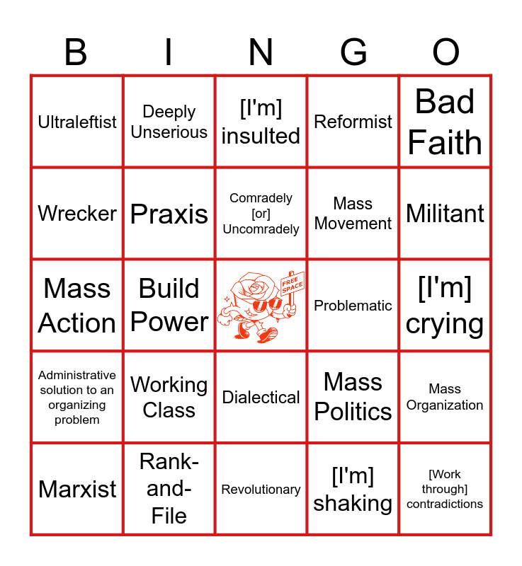 This bingo card has a free space and 24 words: Working Class, Rank-and-File, Comradely [or] Uncomradely, Marxist, Bad Faith, Ultraleftist, Wrecker, Deeply Unserious, Problematic, Dialectical, Mass Movement, Mass Action, Mass Politics, Mass Organization, Praxis, [I'm] shaking, [I'm] crying, [I'm] insulted, Militant, Build Power, [Work through] contradictions, Administrative solution to an organizing problem, Reformist and Revolutionary.