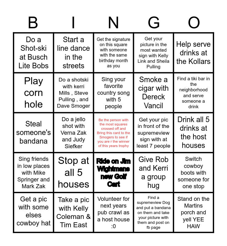 This bingo card has a free space and 24 words: Stop at all 5 houses, Take a pic with Kelly Coleman & Tim East, Sing your favorite country song with 5 people, Get a pic with some elses cowboy hat, Help serve drinks at the Kollars, Do a Shot-ski at Busch Lite Bobs, Play corn hole, Start a line dance in the streets, Get your pic in front of the supremeview sign with at least 7 people, Ride on Jim Wightmans new Golf Cart, Smoke a cigar with Dereck Vancil, Steal someone's bandana, Give Rob and Kerri a group hug, Switch cowboy boots with someone for one stop, Do a shotski with kerri Mills , Steve Pulling , and Dave Smoger, Find a supremeview Dog and put a bandana on them and take your picture with them and post on fb page, Drink all 5 drinks at the host houses, Get the signature on this square with someone with the same birthday month as you, Find a tiki bar in the neighborhood and serve someone a drink, Do a jello shot with Verna Zak and Judy Siefker, Stand on the Martins porch and yell YEE HAW, Sing friends in low places with Mike Springer and Mark Zak, Get your picture in the most wanted sign with Kelly Link and Sheila Pulling and Volunteer for next years pub crawl as a host house :0.