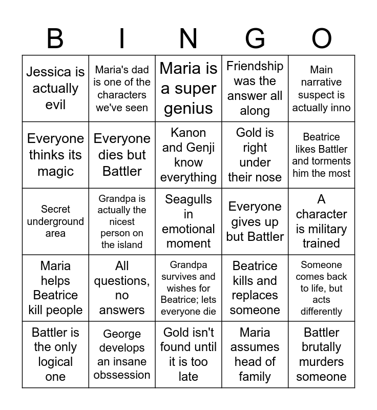 This bingo card has a free space and 24 words: All questions, no answers, George develops an insane obssession, Kanon and Genji know everything, Battler is the only logical one, Main narrative suspect is actually inno, Jessica is actually evil, Everyone thinks its magic, Maria's dad is one of the characters we've seen, Everyone gives up but Battler, Grandpa survives and wishes for Beatrice; lets everyone die, Gold is right under their nose, Secret underground area, Beatrice kills and replaces someone, Someone comes back to life, but acts differently, Everyone dies but Battler, Maria assumes head of family, A character is military trained, Maria is a super genius, Beatrice likes Battler and torments him the most, Grandpa is actually the nicest person on the island, Battler brutally murders someone, Maria helps Beatrice kill people, Friendship was the answer all along and Gold isn't found until it is too late.