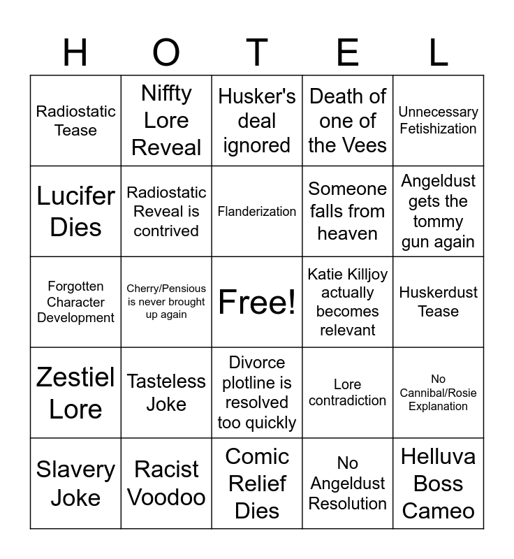 This bingo card has a free space and 24 words: Tasteless Joke, Racist Voodoo, Flanderization, Slavery Joke, Unnecessary Fetishization, Radiostatic Tease, Lucifer Dies, Niffty Lore Reveal, Katie Killjoy actually becomes relevant, Divorce plotline is resolved too quickly, Someone falls from heaven, Forgotten Character Development, Lore contradiction, No Cannibal/Rosie Explanation, Radiostatic Reveal is contrived, No Angeldust Resolution, Huskerdust Tease, Husker's deal ignored, Angeldust gets the tommy gun again, Cherry/Pensious is never brought up again, Helluva Boss Cameo, Zestiel Lore, Death of one of the Vees and Comic Relief Dies.