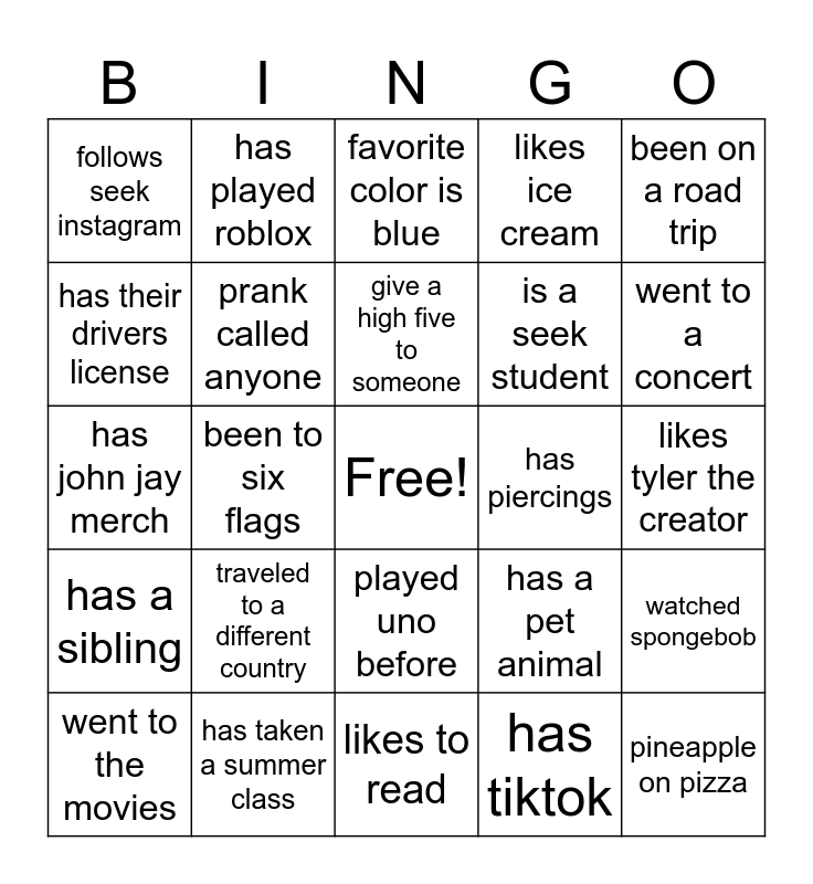 This bingo card has a free space and 24 words: traveled to a different country, has taken a summer class, give a high five to someone, went to the movies, been on a road trip, follows seek instagram, has their drivers license, has played roblox, has piercings, played uno before, is a seek student, has john jay merch, has a pet animal, watched spongebob, prank called anyone, has tiktok, likes tyler the creator, favorite color is blue, went to a concert, been to six flags, pineapple on pizza, has a sibling, likes ice cream and likes to read.
