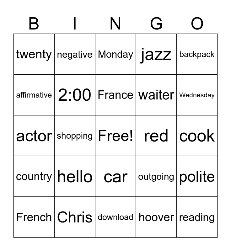 This bingo card has a free space and 24 words: hello, Chris, France, French, backpack, twenty, affirmative, negative, red, car, waiter, actor, outgoing, polite, 2:00, hoover, cook, Monday, Wednesday, shopping, reading, country, jazz and download.