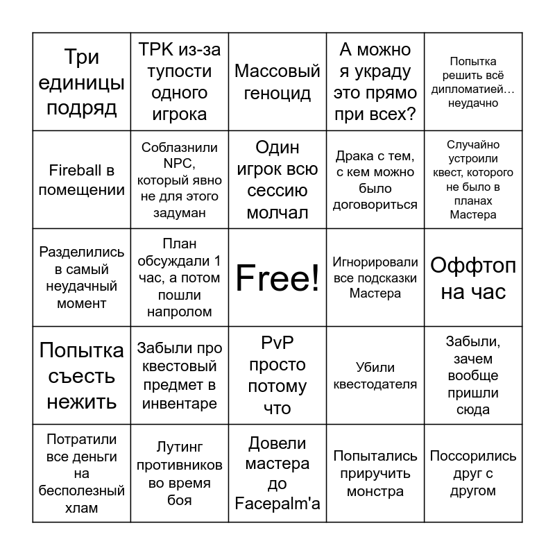 This bingo card has a free space and 24 words: Забыли про квестовый предмет в инвентаре, Лутинг противников во время боя, Один игрок всю сессию молчал, Потратили все деньги на бесполезный хлам, Попытка решить всё дипломатией… неудачно, Три единицы подряд, Fireball в помещении, TPK из-за тупости одного игрока, Игнорировали все подсказки Мастера, PvP просто потому что, Драка с тем, с кем можно было договориться, Разделились в самый неудачный момент, Убили квестодателя, Забыли, зачем вообще пришли сюда, Соблазнили NPC, который явно не для этого задуман, Попытались приручить монстра, Оффтоп на час, Массовый геноцид, Случайно устроили квест, которого не было в планах Мастера, План обсуждали 1 час, а потом пошли напролом, Поссорились друг с другом, Попытка съесть нежить, А можно я украду это прямо при всех? and Довели мастера до Facepalm'а.
