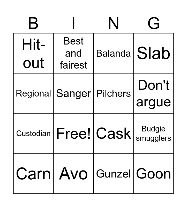 This bingo card has 18 words: Free!, Goon, Balanda, Hit-out, Cask, Slab, Carn, Best and fairest, Don't argue, Custodian, Gunzel, Regional, Budgie smugglers, Sanger, Pilchers, Lolly water, Avo and Selfie.