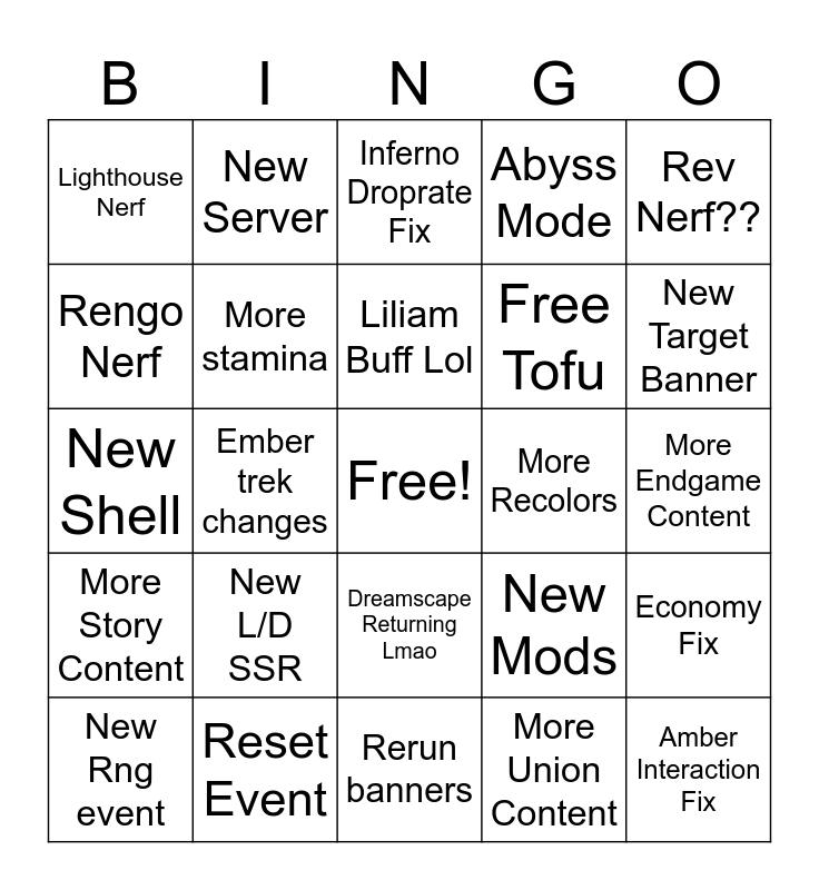 This bingo card has a free space and 24 words: New L/D SSR, Reset Event, Liliam Buff Lol, New Rng event, Rev Nerf??, Lighthouse Nerf, Rengo Nerf, New Server, More Recolors, Dreamscape Returning Lmao, Free Tofu, New Shell, New Mods, Economy Fix, More stamina, More Union Content, More Endgame Content, Inferno Droprate Fix, New Target Banner, Ember trek changes, Amber Interaction Fix, More Story Content, Abyss Mode and Rerun banners.