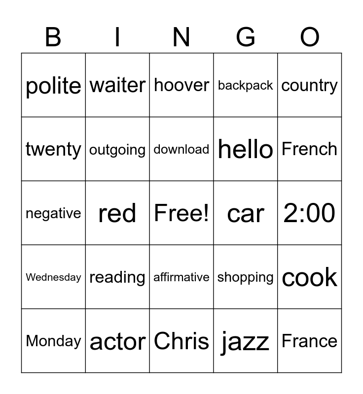 This bingo card has a free space and 24 words: reading, actor, download, Monday, country, polite, twenty, waiter, car, affirmative, hello, negative, shopping, cook, outgoing, jazz, 2:00, hoover, French, red, France, Wednesday, backpack and Chris.