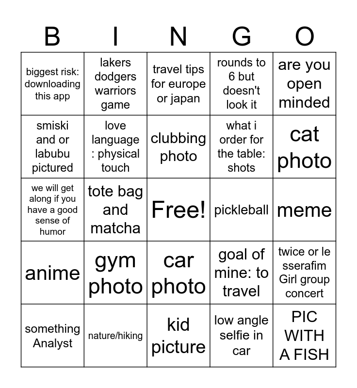 This bingo card has a free space and 29 words: something Analyst, Picture at a rave with >5 people, tote bag and matcha, picture with a dog, biggest risk: downloading this app, travel tips for europe or japan, love language : physical touch, gym photo, pickleball, nature/hiking, meme, PIC WITH A FISH, kid picture, low angle selfie in car, cat photo, I can help boost you in val, car photo, anime, are you open minded, we will get along if you have a good sense of humor, goal of mine: to travel, rock climbing or marathon, what i order for the table: shots, smiski and or labubu pictured, rounds to 6 but doesn't look it, lakers dodgers warriors game, twice or le sserafim Girl group concert, clubbing photo and together lets skip the small talk.