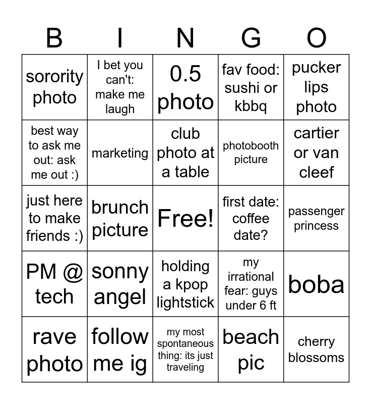 This bingo card has a free space and 29 words: rave photo, venmo listed, brunch picture, photo in europe, sorority photo, 0.5 photo, marketing, sonny angel, first date: coffee date?, follow me ig, passenger princess, cherry blossoms, my most spontaneous thing: its just traveling, beach pic, cartier or van cleef, carry me in val/ league/ overwatch, holding a kpop lightstick, PM @ tech, pucker lips photo, just here to make friends :), my irrational fear: guys under 6 ft, controversial opinion: pineapple on pizza, photobooth picture, best way to ask me out: ask me out :), fav food: sushi or kbbq, I bet you can't: make me laugh, boba, club photo at a table and coachella.