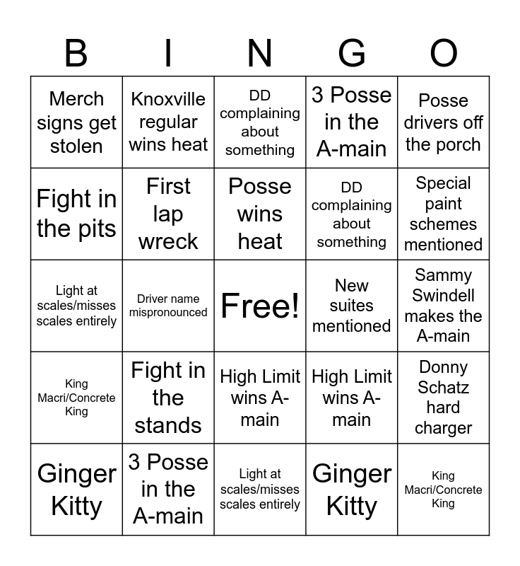 ⚠ This card has duplicate items: Gravel/Larson beef (3), Knoxville regular wins heat (3), Shoey (3), Dingus mentioned (3), New suites mentioned (3), 3 Posse in the A-main (3), Qualifying wings (3), DD complaining about something (3), Posse wins heat (3), Ginger Kitty (3), Johnny mentions High Limit (3), Special paint schemes mentioned (3), Merch signs get stolen (3), Fight in the pits (3), Light at scales/misses scales entirely (3), High Limit wins A-main (3), Posse drivers off the porch (3), First lap wreck (3), Sammy Swindell makes the A-main (3), Fight in the stands (3), King Macri/Concrete King (2), Donny Schatz hard charger (3), Rico, Gravel, or Larson DNF (3)