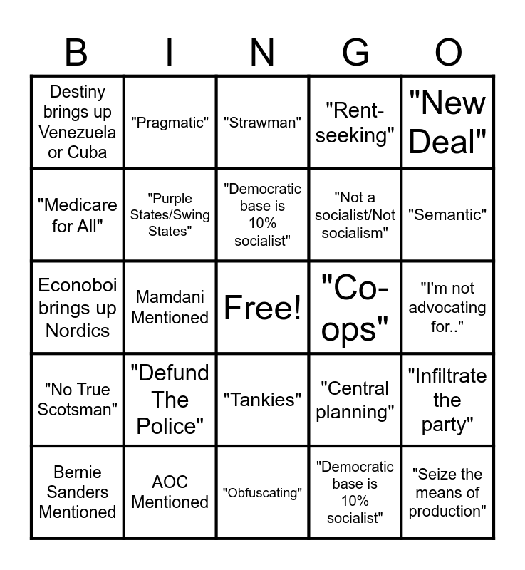 This bingo card has a free space and 24 words: Bernie Sanders Mentioned, "Defund The Police", "Democratic base is 10% socialist", "Democratic base is 10% socialist", "New Deal", Destiny brings up Venezuela or Cuba, "Pragmatic", "Strawman", "Co-ops", "I'm not advocating for..", Econoboi brings up Nordics, "Purple States/Swing States", "Central planning", "Infiltrate the party", "Medicare for All", AOC Mentioned, "Obfuscating", "Rent-seeking", "Semantic", "No True Scotsman", Mamdani Mentioned, "Tankies", "Not a socialist/Not socialism" and "Seize the means of production".