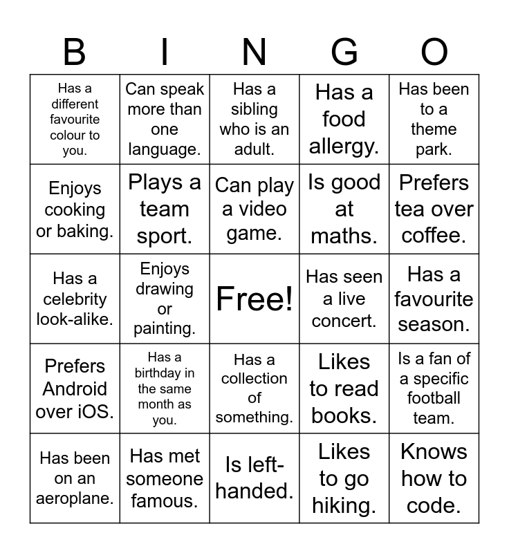 This bingo card has a free space and 50 words: Has a pet dog., Knows how to code., Plays a musical instrument., Is left-handed., Has a birthday in the same month as you., Has travelled to more than three countries., Can speak more than one language., Is the oldest child in their family., Enjoys cooking or baking., Wears glasses or contact lenses., Plays a team sport., Has a food allergy., Is a fan of a specific football team., Likes to read books., Has a younger sibling., Has a favourite subject that isn't Computer Science., Can play a video game., Has seen a live concert., Is learning a new language., Has been to a theme park., Enjoys drawing or painting., Likes to go hiking., Has a different favourite colour to you., Is good at maths., Has a fun fact to share., Is a morning person., Prefers tea over coffee., Has a birthday in an even-numbered month., Has a sibling who is an adult., Has a collection of something., Has a favourite animal., Is good at a video game., Has a secret talent., Has a good sense of humour., Has met someone famous., Can swim a length of a pool without stopping., Has been camping., Can use chopsticks., Can touch their nose with their tongue., Has a favourite season., Likes to eat spicy food., Can tie a tie., Knows how to cook rice., Has a favourite movie genre., Has been on an aeroplane., Has a celebrity look-alike., Has a unique name., Knows all the words to a popular song., Prefers Android over iOS. and Is a good listener..