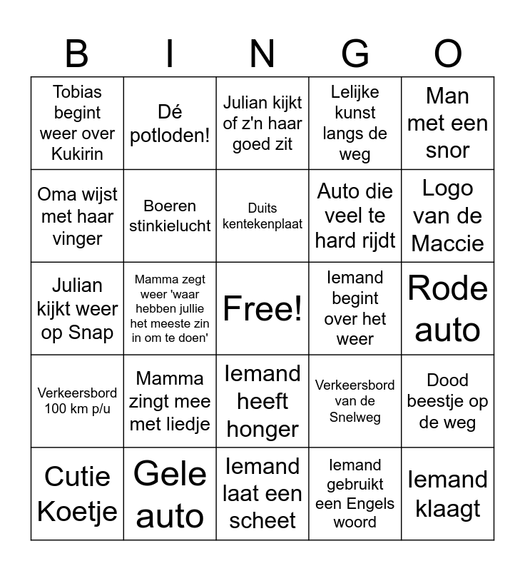 This bingo card has a free space and 24 words: Mamma zingt mee met liedje, Gele auto, Duits kentekenplaat, Cutie Koetje, Man met een snor, Tobias begint weer over Kukirin, Oma wijst met haar vinger, Dé potloden!, Iemand begint over het weer, Iemand heeft honger, Auto die veel te hard rijdt, Julian kijkt weer op Snap, Verkeersbord van de Snelweg, Dood beestje op de weg, Boeren stinkielucht, Iemand gebruikt een Engels woord, Rode auto, Julian kijkt of z'n haar goed zit, Logo van de Maccie, Mamma zegt weer 'waar hebben jullie het meeste zin in om te doen', Iemand klaagt, Verkeersbord 100 km p/u, Lelijke kunst langs de weg and Iemand laat een scheet.