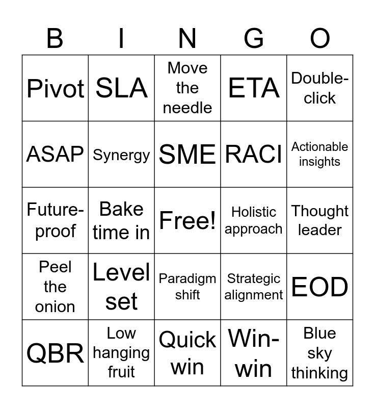 This bingo card has a free space and 30 words: Low hanging fruit, Boil the ocean, Bake time in, Circle back, Pivot, Move the needle, Synergy, Paradigm shift, Holistic approach, Quick win, Thought leader, Blue sky thinking, Win-win, Game changer, Actionable insights, Core competency, Strategic alignment, Peel the onion, Level set, Double-click, Future-proof, KPI, SLA, RACI, ASAP, ETA, EOD, QBR, SME and CRM.