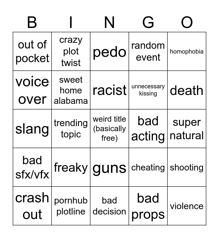 This bingo card has a free space and 24 words: freaky, pornhub plotline, racist, crash out, homophobia, out of pocket, voice over, crazy plot twist, bad acting, guns, unnecessary kissing, slang, cheating, shooting, sweet home alabama, bad props, super natural, pedo, death, trending topic, violence, bad sfx/vfx, random event and bad decision.