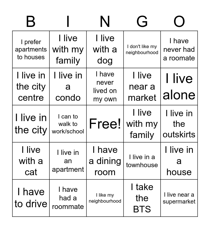 This bingo card has a free space and 24 words: I live in an apartment, I have had a roommate, I have never lived on my own, I have to drive, I have never had a roomate, I prefer apartments to houses, I live in the city centre, I live with my family, I live with my family, I have a dining room, I live near a market, I live in the city, I live in a townhouse, I live in a house, I live in a condo, I take the BTS, I live in the outskirts, I live with a dog, I live alone, I can to walk to work/school, I live near a supermarket, I live with a cat, I don't like my neighbourhood and I like my neighbourhood.
