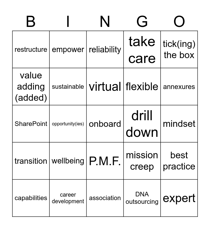 This bingo card has 66 words: Free!, outside the box, win win, best practice, touch base, big picture, empower, inquiry, virtual, probabilistic, P.M.F., validation, mindset, tick(ing) the box, 100 Day Review, value adding (added), opportunity(ies), restructure, deep dive, flexible, wellbeing, transition, take care, moving forward, enhance, workflows, town hall, challenges, onboard, leadership team, capabilities, off line, passion, attrition, mission creep, career development, fatigue, SharePoint, DNA outsourcing, work/life balance, sustainable, logistics, drill down, identification, verification, Griffith University, annexures, opinion, expert, proficiency, quality, analysis, court, expertise, standards, bias, questioned, reproducibilty, reliability, association, fatal, repeatable, gluten, mornos, resilience and forensic register.