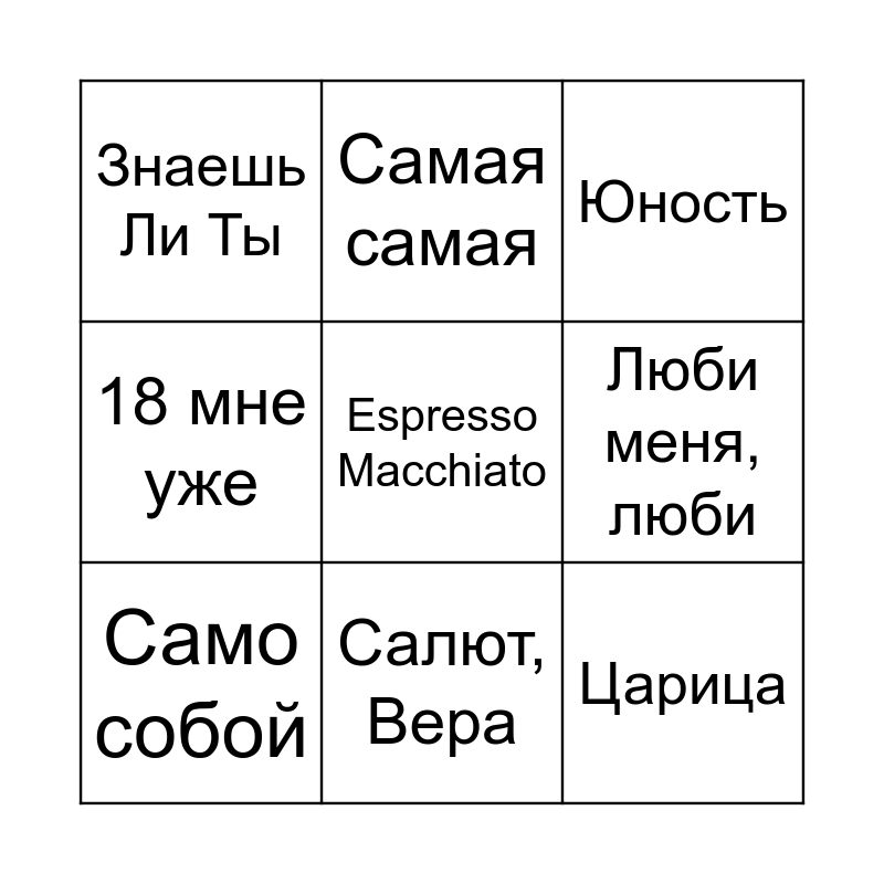 This bingo card has 20 words: Попытка №5, Районы-кварталы, Юность, Freed From Desire, Сансара, Espresso Macchiato, Я эту жизнь тебе отдам, Знаешь Ли Ты, Царица, Самая самая, Я это ты, Ночь, Люби меня, люби, Комета, Само собой, Мурашками, Салют, Вера, 18 мне уже, Beautiful Things and Pedro.