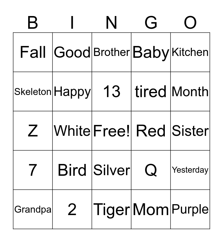 This bingo card has a free space and 25 words: Bird, Tiger, 13, Grandpa, Kitchen, Fall, Skeleton, Good, Red, Silver, tired, Z, Q, Yesterday, Happy, Angry/Mad, Sister, Brother, Month, White, Purple, 2, 7, Baby and Mom.