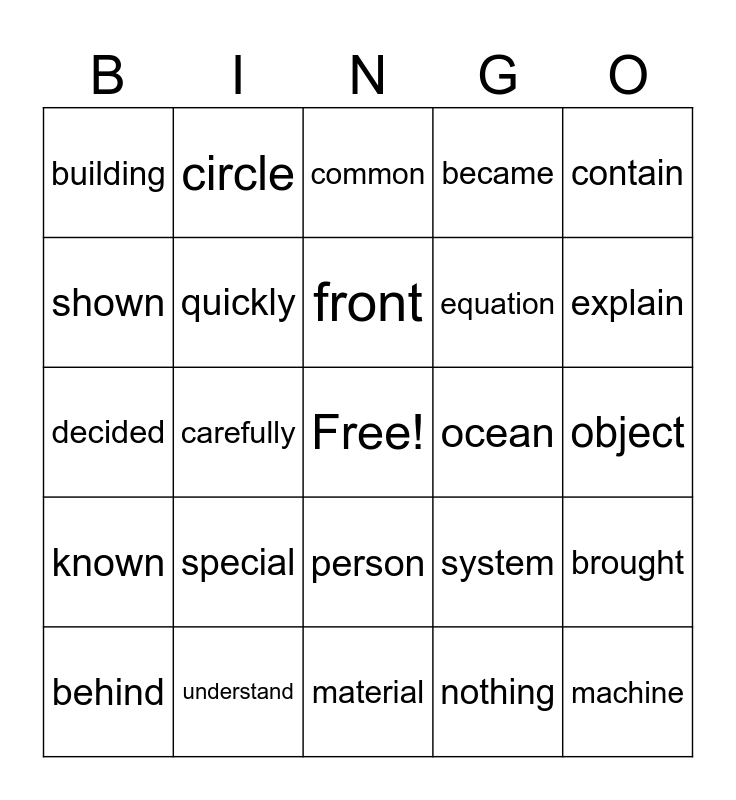 This bingo card has a free space and 35 words: English, finally, correct, quickly, person, became, shown, minutes, front, street, decided, contain, surface, produce, building, ocean, nothing, carefully, known, machine, system, behind, brought, understand, common, explain, language, thousand, equation, object, among, material, special, circle and built.