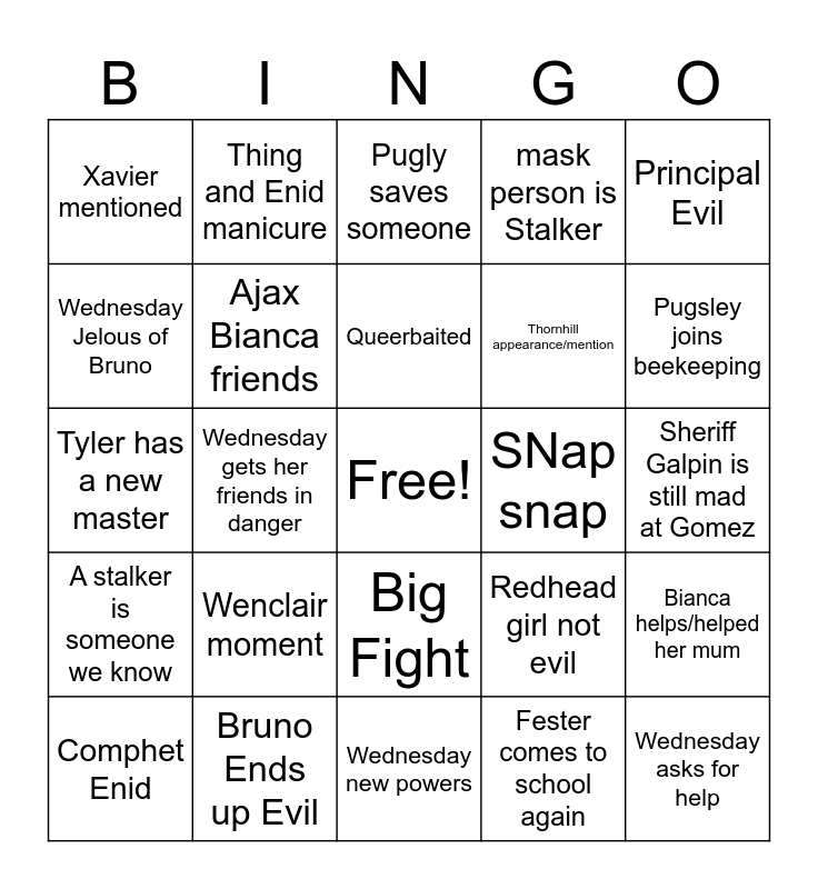 This bingo card has a free space and 24 words: Wenclair moment, Bruno Ends up Evil, Queerbaited, Comphet Enid, Principal Evil, Xavier mentioned, Wednesday Jelous of Bruno, Thing and Enid manicure, SNap snap, Big Fight, Thornhill appearance/mention, Tyler has a new master, Redhead girl not evil, Bianca helps/helped her mum, Ajax Bianca friends, Fester comes to school again, Sheriff Galpin is still mad at Gomez, Pugly saves someone, Pugsley joins beekeeping, Wednesday gets her friends in danger, Wednesday asks for help, A stalker is someone we know, mask person is Stalker and Wednesday new powers.