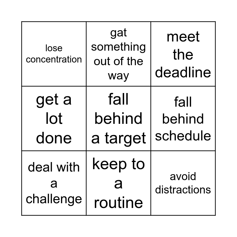 This bingo card has a free space and 8 words: fall behind schedule, meet the deadline, gat something out of the way, deal with a challenge, lose concentration, avoid distractions, get a lot done and keep to a routine.