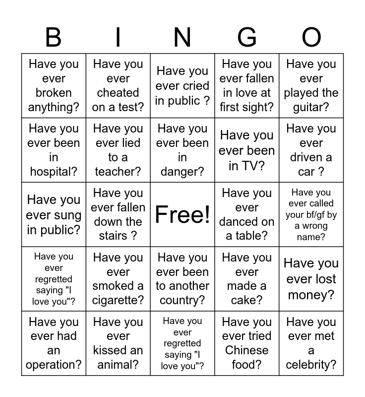 This bingo card has a free space and 24 words: Have you ever smoked a cigarette?, Have you ever kissed an animal?, Have you ever been in danger?, Have you ever had an operation?, Have you ever played the guitar?, Have you ever broken anything?, Have you ever been in hospital?, Have you ever cheated on a test?, Have you ever danced on a table?, Have you ever been to another country?, Have you ever been in TV?, Have you ever sung in public?, Have you ever made a cake?, Have you ever lost money?, Have you ever lied to a teacher?, Have you ever tried Chinese food?, Have you ever called your bf/gf by a wrong name?, Have you ever cried in public ?, Have you ever driven a car ?, Have you ever fallen down the stairs ?, Have you ever met a celebrity?, Have you ever regretted saying "I love you"?, Have you ever fallen in love at first sight? and Have you ever regretted saying "I love you"?.