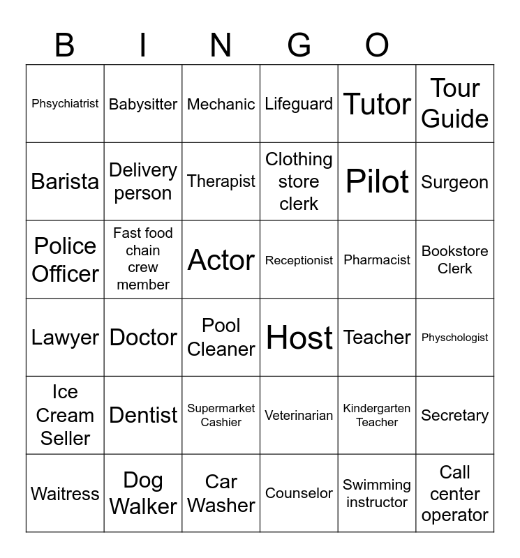 This bingo card has 48 words: Chef, Police Officer, Journalist, Teacher, Pharmacist, Veterinarian, Babysitter, Waiter, Tour Guide, Dog Walker, Barista, Lifeguard, Doctor, Lawyer, Call center operator, Supermarket Cashier, Delivery person, Fast food chain crew member, Gardener, Tutor, Surgeon, Physchologist, Phsychiatrist, Therapist, Pilot, Clothing store clerk, Pool Cleaner, Event Staff, Bookstore Clerk, Receptionist, Truck Driver, Dentist, Swimming instructor, Photographer, Host, Car Washer, Counselor, Actor, Waitress, House cleaner, Kindergarten Teacher, Ice Cream Seller, Mechanic, Actress, Pilot, Taxi driver, Secretary and Comedian.