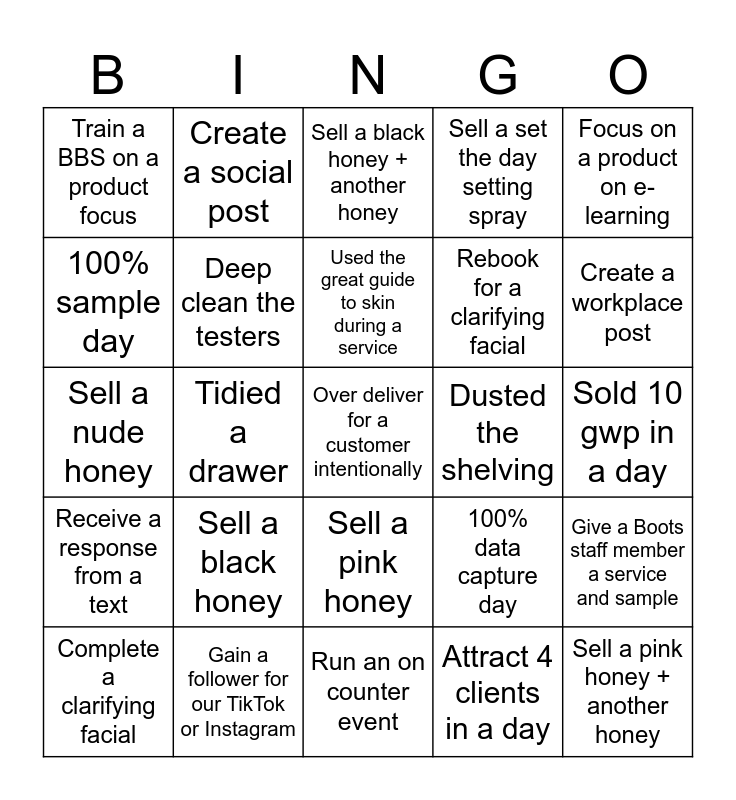 This bingo card has a free space and 24 words: Sell a black honey, Gain a follower for our TikTok or Instagram, Used the great guide to skin during a service, Complete a clarifying facial, Focus on a product on e-learning, Train a BBS on a product focus, 100% sample day, Create a social post, Dusted the shelving, Sell a pink honey, Rebook for a clarifying facial, Sell a nude honey, 100% data capture day, Give a Boots staff member a service and sample, Deep clean the testers, Attract 4 clients in a day, Sold 10 gwp in a day, Sell a black honey + another honey, Create a workplace post, Tidied a drawer, Sell a pink honey + another honey, Receive a response from a text, Sell a set the day setting spray and Run an on counter event.