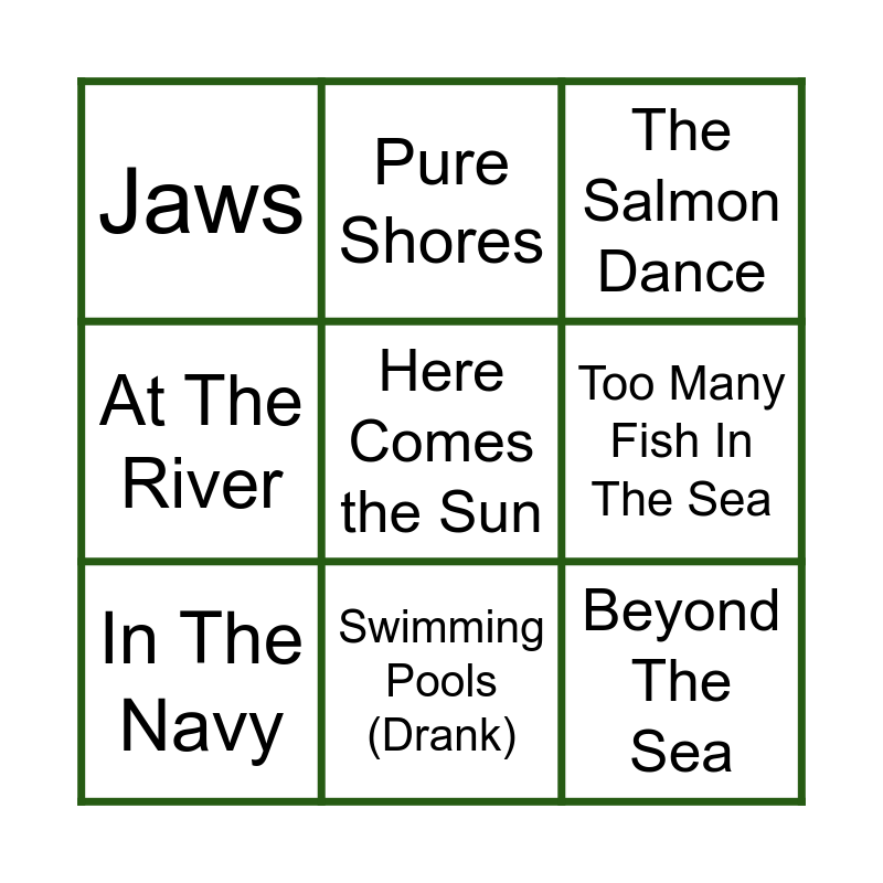 This bingo card has 21 words: Islands In The Stream, Smoke On The Water, Pure Shores, Waterfalls, (Sittin’ On) The Dock Of The Bay, In The Navy, Jaws, The Salmon Dance, Under The Sea, Swimming Pools (Drank), Beyond The Sea, At The River, Cry Me a River, Surfin’ USA, Too Many Fish In The Sea, Rockaway Beach, Love Really Hurts Without You, Rock The Boat, Here Comes the Sun, The Tide Is High and Orinoco Flow.