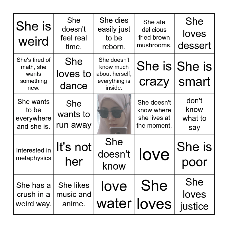 This bingo card has a free space and 24 words: It's not her, She likes music and anime., She doesn't know much about herself, everything is inside., She has a crush in a weird way., She loves dessert, She is weird, She's tired of math, she wants something new., She doesn't feel real time., She doesn't know where she lives at the moment., She doesn't know, She is crazy, She wants to be everywhere and she is., love, She is poor, She loves to dance, She loves, don't know what to say, She dies easily just to be reborn., She is smart, She wants to run away, She loves justice, Interested in metaphysics, She ate delicious fried brown mushrooms. and love water.