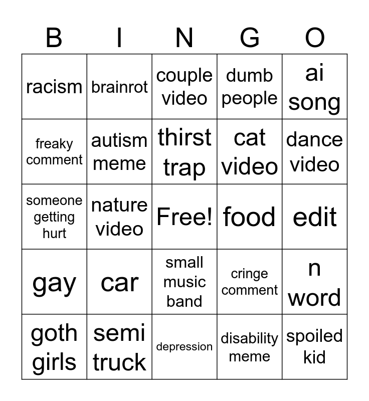 This bingo card has a free space and 24 words: car, semi truck, thirst trap, goth girls, ai song, racism, freaky comment, brainrot, food, small music band, cat video, someone getting hurt, cringe comment, n word, autism meme, disability meme, edit, couple video, dance video, nature video, spoiled kid, gay, dumb people and depression.