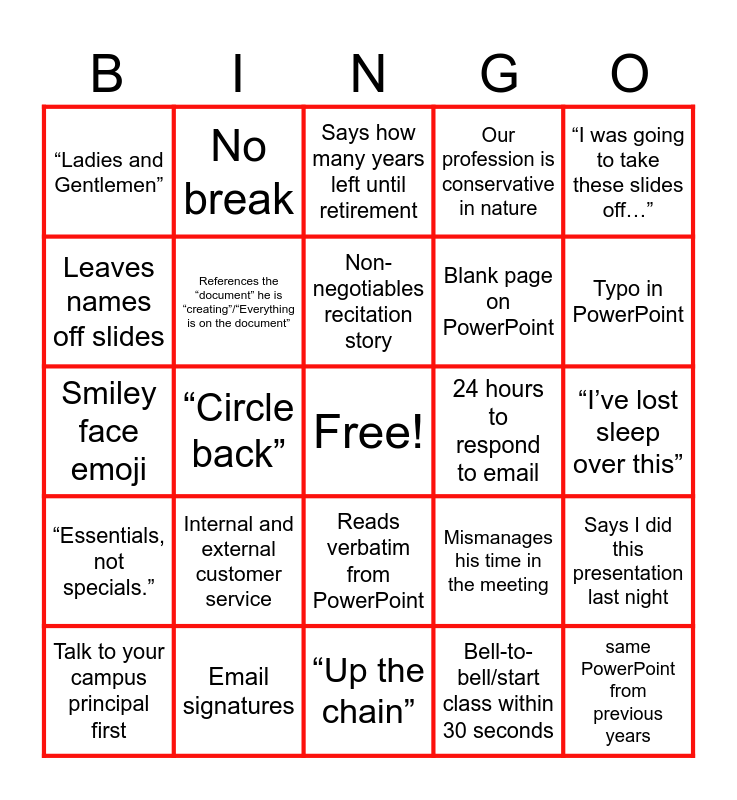 This bingo card has a free space and 29 words: Talk to your campus principal first, Fat Gym coach analogy, “Circle back”, References other DFAs in other districts, “Ladies and Gentlemen”, Says how many years left until retirement, References the “document” he is “creating”/“Everything is on the document”, Internal and external customer service, 24 hours to respond to email, Email signatures, “I’ve lost sleep over this”, same PowerPoint from previous years, “Up the chain”, Bell-to-bell/start class within 30 seconds, Typo in PowerPoint, Can’t work the meeting’s technology, Reads verbatim from PowerPoint, “Essentials, not specials.”, “I was going to take these slides off…”, Smiley face emoji, Mismanages his time in the meeting, Makes us put away devices during meeting, Blank page on PowerPoint, Leaves names off slides, Our profession is conservative in nature, No break, Says I did this presentation last night, Non-negotiables recitation story and That’s why I teach in Texas.