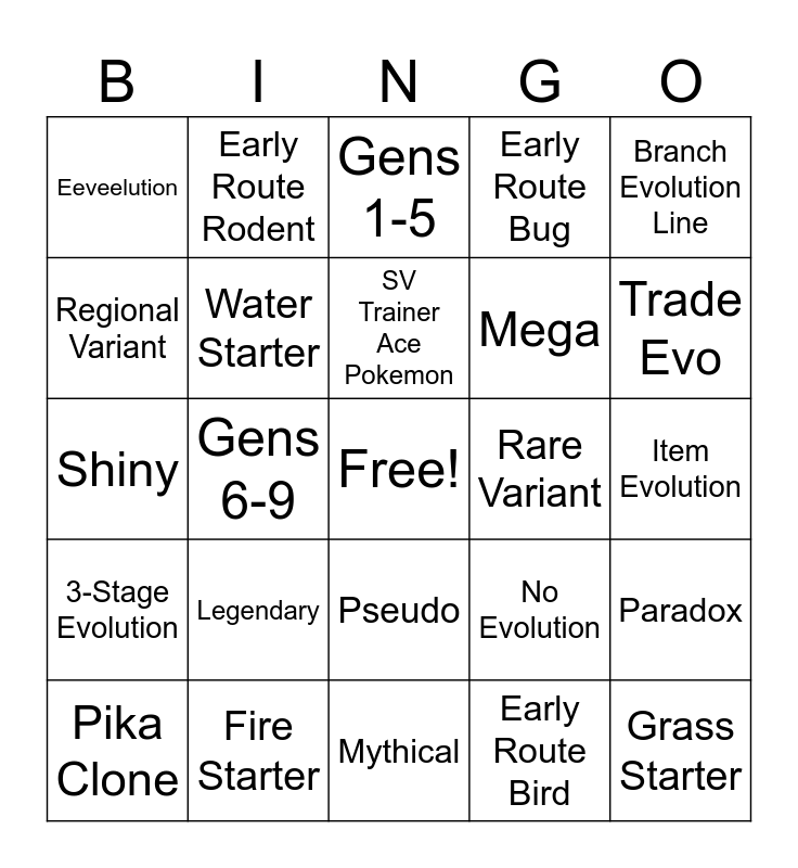 This bingo card has a free space and 24 words: Legendary, Fire Starter, SV Trainer Ace Pokemon, Pika Clone, Branch Evolution Line, Eeveelution, Regional Variant, Early Route Rodent, Rare Variant, Pseudo, Mega, Shiny, No Evolution, Paradox, Water Starter, Early Route Bird, Item Evolution, Gens 1-5, Trade Evo, Gens 6-9, Grass Starter, 3-Stage Evolution, Early Route Bug and Mythical.