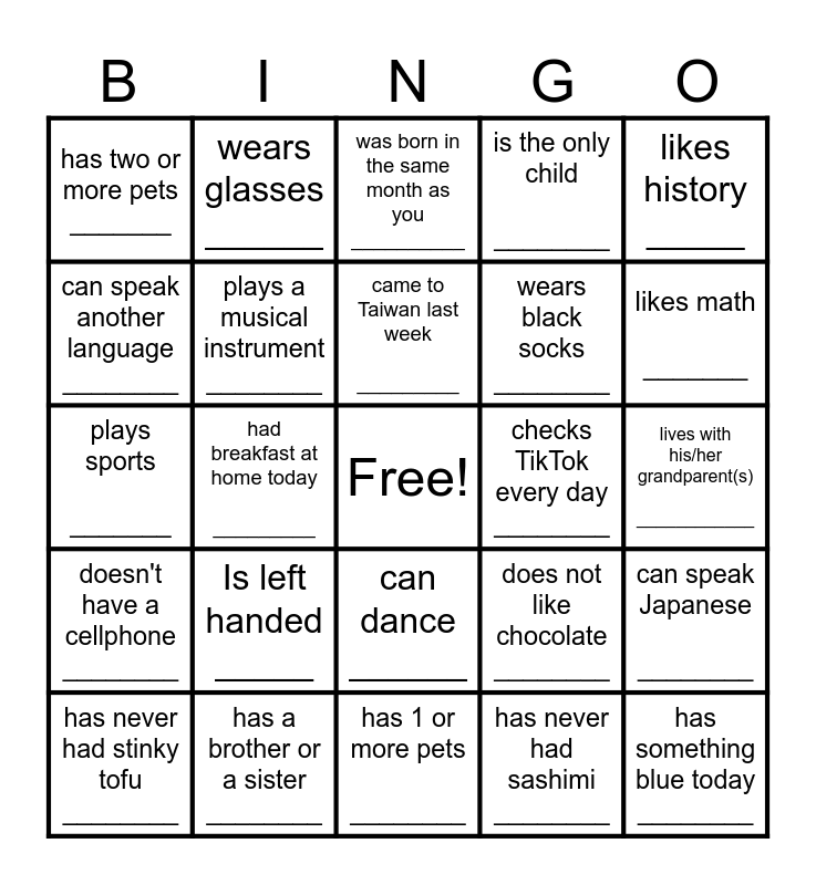 This bingo card has a free space and 24 words: Is left handed _____, has a brother or a sister ________, came to Taiwan last week _________, has never had stinky tofu ________, likes history _____, has two or more pets _______, can speak another language ________, wears glasses ______, checks TikTok every day ________, can dance ______, wears black socks ________, plays sports _______, does not like chocolate ________, can speak Japanese ________, plays a musical instrument ________, has never had sashimi ________, lives with his/her grandparent(s) ____________, was born in the same month as you __________, likes math _______, had breakfast at home today _________, has something blue today ________, doesn't have a cellphone ________, is the only child ________ and has 1 or more pets ________.