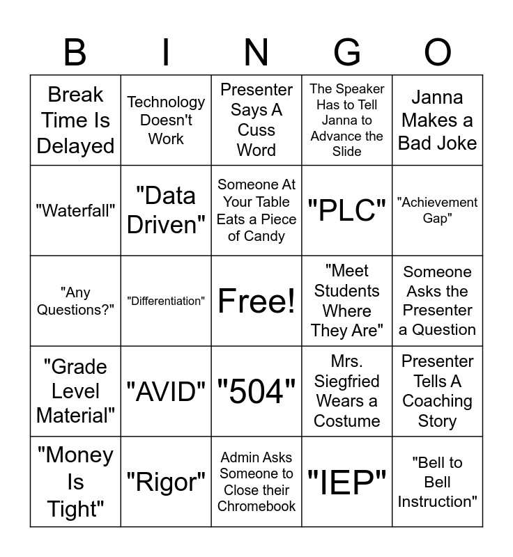 This bingo card has a free space and 24 words: "AVID", "Rigor", Someone At Your Table Eats a Piece of Candy, "Money Is Tight", Janna Makes a Bad Joke, Break Time Is Delayed, "Waterfall", Technology Doesn't Work, "Meet Students Where They Are", "504", "PLC", "Any Questions?", Mrs. Siegfried Wears a Costume, Presenter Tells A Coaching Story, "Data Driven", "IEP", Someone Asks the Presenter a Question, Presenter Says A Cuss Word, "Achievement Gap", "Differentiation", "Bell to Bell Instruction", "Grade Level Material", The Speaker Has to Tell Janna to Advance the Slide and Admin Asks Someone to Close their Chromebook.