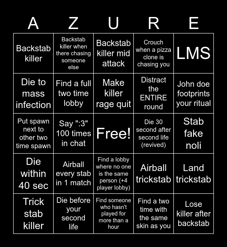 This bingo card has a free space and 24 words: Trick stab killer, Airball every stab in 1 match, Make killer rage quit, Find a two time with the same skin as you, LMS, Backstab killer, Backstab killer when there chasing someone else, Backstab killer mid attack, Die 30 second after second life (revived), Stab fake noli, Put spawn next to other two time spawn, Find a full two time lobby, Airball trickstab, Land trickstab, Die to mass infection, Die before your second life, Find someone who hasn't played for more than a hour, Crouch when a pizza clone is chasing you, John doe footprints your ritual, Die within 40 sec, Say ":3" 100 times in chat, Find a lobby where no one is the same person (+4 player lobby), Distract the ENTIRE round and Lose killer after backstab.