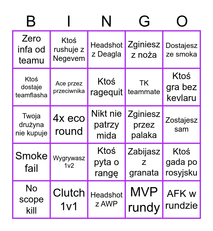 This bingo card has 25 words: Wygrywasz 1v2, Headshot z AWP, Ktoś ragequit, No scope kill, Dostajesz ze smoka, Zero infa od teamu, Ktoś dostaje teamflasha, Ktoś rushuje z Negevem, Zginiesz przez palaka, Ktoś pyta o rangę, TK teammate, Twoja drużyna nie kupuje, Zabijasz z granata, Ktoś gada po rosyjsku, Ace przez przeciwnika, AFK w rundzie, Zostajesz sam, Headshot z Deagla, Ktoś gra bez kevlaru, 4x eco round, Nikt nie patrzy mida, Clutch 1v1, Smoke fail, Zginiesz z noża and MVP rundy.