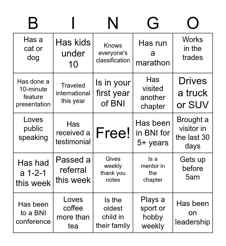 This bingo card has a free space and 24 words: Passed a referral this week, Loves coffee more than tea, Is in your first year of BNI, Has been to a BNI conference, Works in the trades, Has a cat or dog, Has done a 10-minute feature presentation, Has kids under 10, Has been in BNI for 5+ years, Gives weekly thank you notes, Has visited another chapter, Loves public speaking, Is a mentor in the chapter, Gets up before 5am, Traveled international this year, Plays a sport or hobby weekly, Brought a visitor in the last 30 days, Knows everyone's classification, Drives a truck or SUV, Has received a testimonial, Has been on leadership, Has had a 1-2-1 this week, Has run a marathon and Is the oldest child in their family.