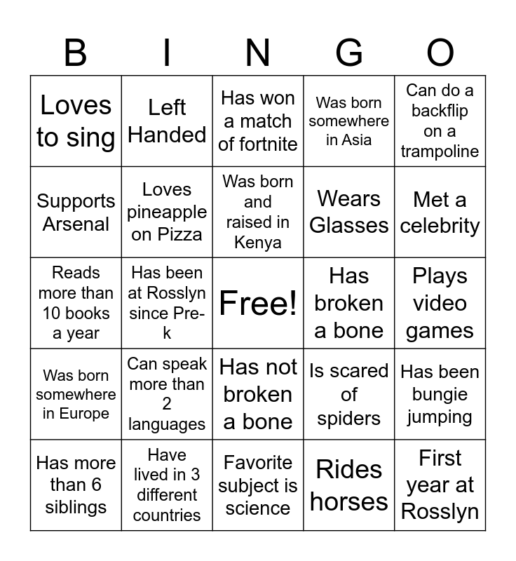 This bingo card has a free space and 24 words: Can speak more than 2 languages, Have lived in 3 different countries, Was born and raised in Kenya, Has more than 6 siblings, Can do a backflip on a trampoline, Loves to sing, Supports Arsenal, Left Handed, Has broken a bone, Has not broken a bone, Wears Glasses, Reads more than 10 books a year, Is scared of spiders, Has been bungie jumping, Loves pineapple on Pizza, Rides horses, Plays video games, Has won a match of fortnite, Met a celebrity, Has been at Rosslyn since Pre-k, First year at Rosslyn, Was born somewhere in Europe, Was born somewhere in Asia and Favorite subject is science.