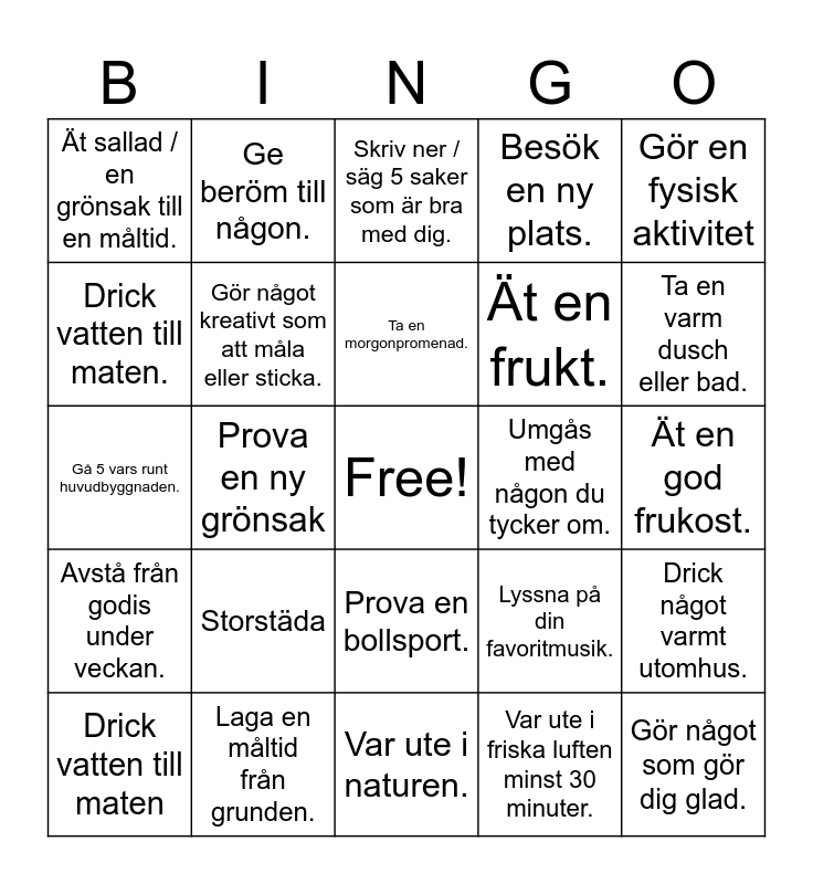 This bingo card has a free space and 24 words: Storstäda, Laga en måltid från grunden., Ta en morgonpromenad., Drick vatten till maten, Gör en fysisk aktivitet, Ät sallad / en grönsak till en måltid., Drick vatten till maten., Ge beröm till någon., Umgås med någon du tycker om., Prova en bollsport., Ät en frukt., Gå 5 vars runt huvudbyggnaden., Lyssna på din favoritmusik., Drick något varmt utomhus., Gör något kreativt som att måla eller sticka., Var ute i friska luften minst 30 minuter., Ät en god frukost., Skriv ner / säg 5 saker som är bra med dig., Ta en varm dusch eller bad., Prova en ny grönsak, Gör något som gör dig glad., Avstå från godis under veckan., Besök en ny plats. and Var ute i naturen..
