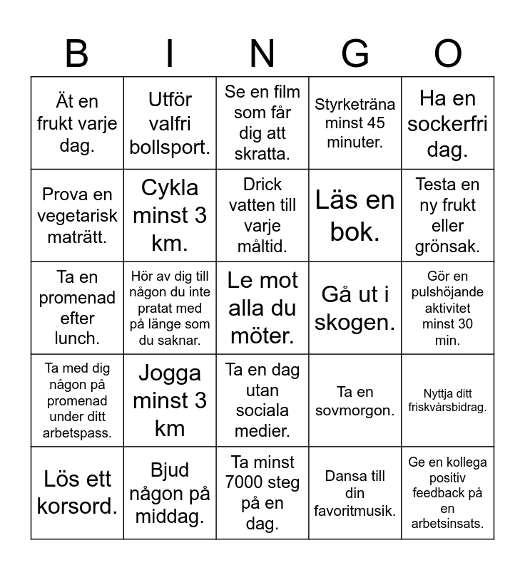This bingo card has a free space and 24 words: Jogga minst 3 km, Bjud någon på middag., Drick vatten till varje måltid., Lös ett korsord., Ha en sockerfri dag., Ät en frukt varje dag., Prova en vegetarisk maträtt., Utför valfri bollsport., Gå ut i skogen., Ta en dag utan sociala medier., Läs en bok., Ta en promenad efter lunch., Ta en sovmorgon., Nyttja ditt friskvårsbidrag., Cykla minst 3 km., Dansa till din favoritmusik., Gör en pulshöjande aktivitet minst 30 min., Se en film som får dig att skratta., Testa en ny frukt eller grönsak., Hör av dig till någon du inte pratat med på länge som du saknar., Ge en kollega positiv feedback på en arbetsinsats., Ta med dig någon på promenad under ditt arbetspass., Styrketräna minst 45 minuter. and Ta minst 7000 steg på en dag..