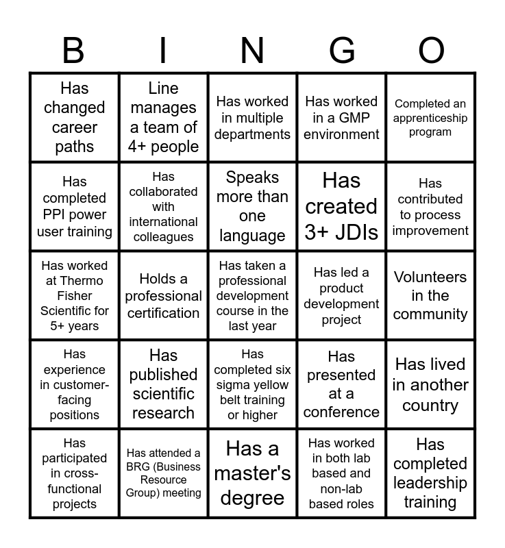 This bingo card has a free space and 24 words: Has published scientific research, Has attended a BRG (Business Resource Group) meeting, Speaks more than one language, Has participated in cross-functional projects, Completed an apprenticeship program, Has changed career paths, Has completed PPI power user training, Line manages a team of 4+ people, Has led a product development project, Has completed six sigma yellow belt training or higher, Has created 3+ JDIs, Has worked at Thermo Fisher Scientific for 5+ years, Has presented at a conference, Has lived in another country, Has collaborated with international colleagues, Has worked in both lab based and non-lab based roles, Volunteers in the community, Has worked in multiple departments, Has contributed to process improvement, Holds a professional certification, Has completed leadership training, Has experience in customer-facing positions, Has worked in a GMP environment and Has a master's degree.