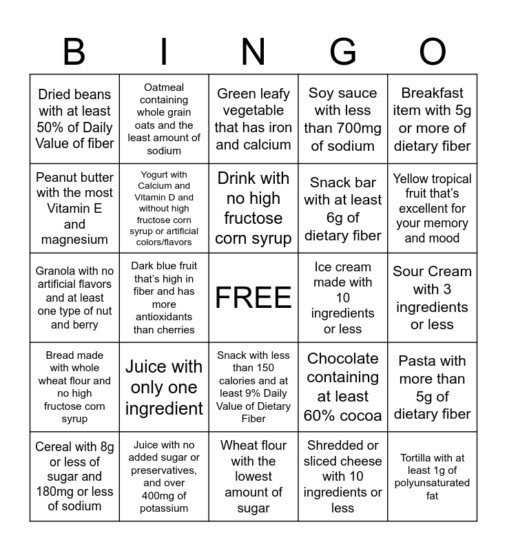 This bingo card has a free space and 24 words: Juice with only one ingredient, Juice with no added sugar or preservatives, and over 400mg of potassium, Drink with no high fructose corn syrup, Cereal with 8g or less of sugar and 180mg or less of sodium, Breakfast item with 5g or more of dietary fiber, Dried beans with at least 50% of Daily Value of fiber, Peanut butter with the most Vitamin E and magnesium, Oatmeal containing whole grain oats and the least amount of sodium, Ice cream made with 10 ingredients or less, Snack with less than 150 calories and at least 9% Daily Value of Dietary Fiber, Snack bar with at least 6g of dietary fiber, Granola with no artificial flavors and at least one type of nut and berry, Chocolate containing at least 60% cocoa, Pasta with more than 5g of dietary fiber, Yogurt with Calcium and Vitamin D and without high fructose corn syrup or artificial colors/flavors, Shredded or sliced cheese with 10 ingredients or less, Sour Cream with 3 ingredients or less, Green leafy vegetable that has iron and calcium, Yellow tropical fruit that’s excellent for your memory and mood, Dark blue fruit that’s high in fiber and has more antioxidants than cherries, Tortilla with at least 1g of polyunsaturated fat, Bread made with whole wheat flour and no high fructose corn syrup, Soy sauce with less than 700mg of sodium and Wheat flour with the lowest amount of sugar.