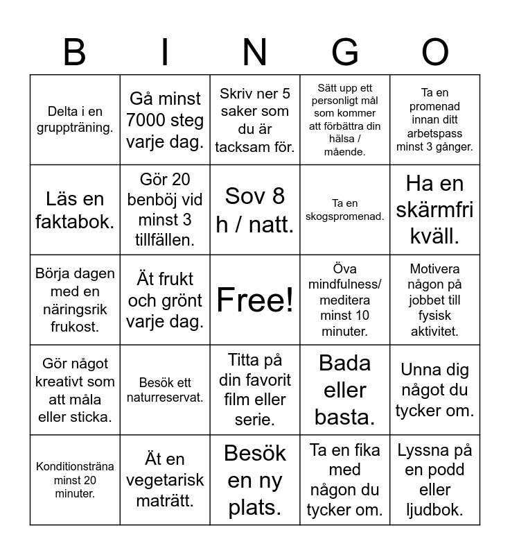This bingo card has a free space and 24 words: Besök ett naturreservat., Ät en vegetarisk maträtt., Sov 8 h / natt., Konditionsträna minst 20 minuter., Ta en promenad innan ditt arbetspass minst 3 gånger., Delta i en gruppträning., Läs en faktabok., Gå minst 7000 steg varje dag., Öva mindfulness/ meditera minst 10 minuter., Titta på din favorit film eller serie., Ta en skogspromenad., Börja dagen med en näringsrik frukost., Bada eller basta., Unna dig något du tycker om., Gör 20 benböj vid minst 3 tillfällen., Ta en fika med någon du tycker om., Motivera någon på jobbet till fysisk aktivitet., Skriv ner 5 saker som du är tacksam för., Ha en skärmfri kväll., Ät frukt och grönt varje dag., Lyssna på en podd eller ljudbok., Gör något kreativt som att måla eller sticka., Sätt upp ett personligt mål som kommer att förbättra din hälsa / mående. and Besök en ny plats..