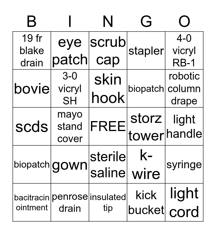 This bingo card has a free space and 24 words: gown, penrose drain, skin hook, bacitracin ointment, 4-0 vicryl RB-1, 19 fr blake drain, bovie, eye patch, storz tower, sterile saline, biopatch, scds, k-wire, syringe, 3-0 vicryl SH, kick bucket, light handle, scrub cap, robotic column drape, mayo stand cover, light cord, biopatch, stapler and insulated tip.