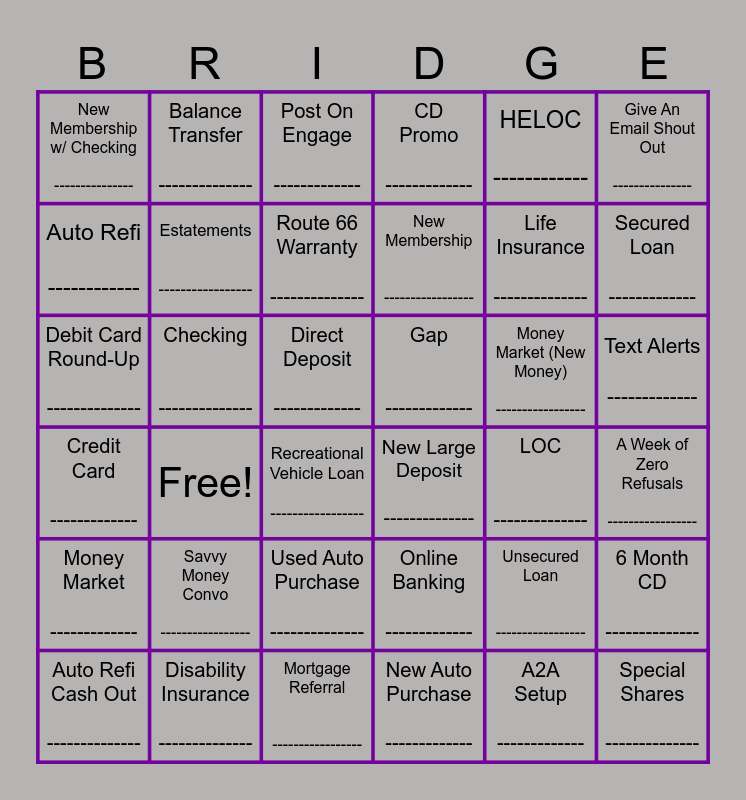 This bingo card has 36 words: Online Banking -------------, Used Auto Purchase --------------, New Auto Purchase -------------, Auto Refi ------------, Credit Card -------------, Gap -------------, Estatements -----------------, Mortgage Referral -----------------, HELOC ------------, Unsecured Loan -----------------, Secured Loan -------------, CD Promo -------------, 6 Month CD --------------, Checking --------------, New Membership -----------------, New Membership w/ Checking ---------------, Money Market -------------, Money Market (New Money) -----------------, Debit Card Round-Up --------------, Post On Engage -------------, Direct Deposit -------------, Free!, New Large Deposit --------------, Recreational Vehicle Loan -----------------, LOC --------------, Balance Transfer --------------, Life Insurance --------------, Disability Insurance --------------, Route 66 Warranty --------------, Give An Email Shout Out ---------------, Special Shares --------------, Auto Refi Cash Out --------------, A Week of Zero Refusals -----------------, Text Alerts -------------, Savvy Money Convo ----------------- and A2A Setup -------------.