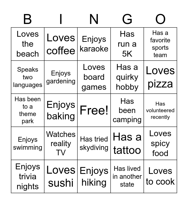 This bingo card has a free space and 50 words: Has a pet, Loves to cook, Has traveled abroad, Enjoys hiking, Watches reality TV, Can play an instrument, Loves coffee, Has been to a concert, Speaks two languages, Has a favorite book, Enjoys gardening, Has run a 5K, Loves spicy food, Has a tattoo, Enjoys dancing, Has met a celebrity, Loves board games, Has been camping, Can sing well, Has a favorite sports team, Enjoys baking, Has lived in another state, Loves the beach, Has a quirky hobby, Enjoys photography, Has been on a cruise, Loves pizza, Has a big family, Enjoys karaoke, Has tried skydiving, Loves sci-fi movies, Has a morning routine, Enjoys crafts, Has a favorite podcast, Loves sushi, Has been to a festival, Enjoys yoga, Has a favorite comedian, Loves ice cream, Has volunteered recently, Enjoys puzzles, Has a favorite TV show, Loves road trips, Has a hidden talent, Enjoys trivia nights, Has been to a theme park, Loves breakfast food, Has a favorite app, Enjoys swimming and Has a fun nickname.